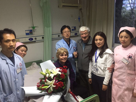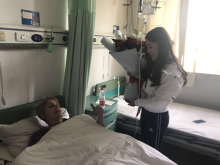 急診室內(nèi),搶救工作有條不紊的進(jìn)行著,以最快的速度完成了患者相關(guān)的各項(xiàng)檢查,并及時(shí)給予系列治療,患者癥狀很快得到好轉(zhuǎn)。王丙聚院長(zhǎng)詳細(xì)的向英國(guó)客人介紹了患者的病情以及搶救治療經(jīng)過(guò),并安排進(jìn)一步留院觀察處理。聞?dòng)嵹s來(lái)的內(nèi)科綜合辦全體成員拿著鮮花將我們的祝福與愛(ài)送到了英國(guó)友人Ellen Griffin身邊,她感動(dòng)的拉著我院內(nèi)科病院王夢(mèng)嬌主管的手不停地說(shuō)著“Thanks”,并豎起大拇指給我們點(diǎn)贊,說(shuō)我們的醫(yī)院的服務(wù)是最好的。