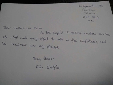 經(jīng)過(guò)一番細(xì)致診療與照護(hù),Ellen Griffin病情明顯改善,下午六時(shí)許,老人經(jīng)過(guò)治療后,恢復(fù)的非常好,由于行程的安排,他們要轉(zhuǎn)機(jī)去北京,醫(yī)院的專(zhuān)家組經(jīng)慎重評(píng)估后認(rèn)為可以轉(zhuǎn)機(jī),但囑咐她們要注意休息,勞逸結(jié)合,及時(shí)復(fù)診,老人和他的丈夫非常感謝我們,臨走時(shí)還給我們寫(xiě)了一段感謝的話:Dear doctors and nurses,At the hospitail ,I receivd excellent service,the staff made every effort to make me feel comfortable ,and the treatment was very efficient(謝謝,非常感謝你們延安大學(xué)咸陽(yáng)醫(yī)院的及時(shí)救治,我現(xiàn)在感覺(jué)好多了。你們的服務(wù)讓我感到非常滿意,你們的醫(yī)術(shù)非常棒!謝謝?。?,遞給了內(nèi)科病院綜合辦王夢(mèng)嬌主管,王夢(mèng)嬌主管看到這一段話后感到非常的激動(dòng),她說(shuō):“其實(shí)我們也沒(méi)做什么,我們只做了我們應(yīng)該做的!”。最后在場(chǎng)的醫(yī)護(hù)人員應(yīng)老人一家的邀請(qǐng)一起進(jìn)行了合影留念,老人在一片歡笑聲中離開(kāi)了醫(yī)院,繼續(xù)她的中國(guó)之旅的下一站—北京之行。