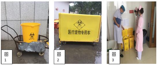 (圖1為整改前的醫(yī)療廢物轉(zhuǎn)運車,圖2為整改后的醫(yī)療廢物轉(zhuǎn)運車,圖3為醫(yī)療廢物督導(dǎo)檢查)
