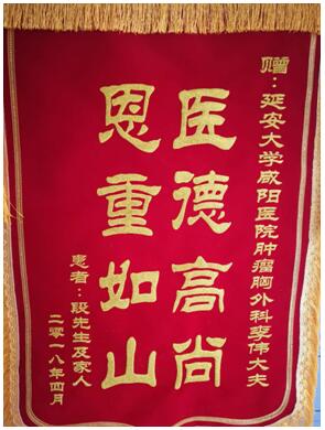 在腫瘤胸外科醫(yī)護(hù)人員的悉心照顧和精心治療下,患者已康復(fù)出院,為表達(dá)救命之恩,患者及家屬特贈(zèng)送一面書(shū)寫(xiě)著“恩重如山,醫(yī)德高尚”的錦旗。