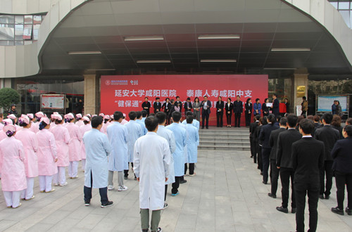 10月16日上午10:00,延安大學(xué)咸陽(yáng)醫(yī)院腦血管病醫(yī)院樓前集聚著醫(yī)療、護(hù)理和商業(yè)保險(xiǎn)代理人方隊(duì)。在這里,精誠(chéng)醫(yī)療集團(tuán)財(cái)務(wù)總監(jiān)呂輝、延安大學(xué)咸陽(yáng)醫(yī)院董事長(zhǎng)李衛(wèi)軍、泰康人壽保險(xiǎn)公司陜西分公司副總經(jīng)理齊燕蕓、咸陽(yáng)中支總經(jīng)理李寶斌、延安大學(xué)咸陽(yáng)醫(yī)院院長(zhǎng)助理沙寧與大家共同見(jiàn)證“健保通”直付式理賠在延安大學(xué)咸陽(yáng)醫(yī)院正式啟動(dòng)。