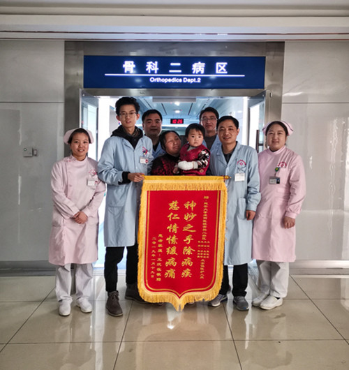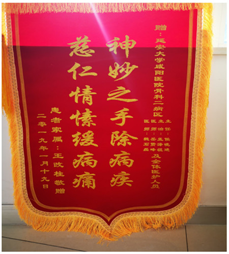 為表示感謝,患兒家屬特贈(zèng)侯曉進(jìn)主任及骨科二病區(qū)全體醫(yī)護(hù)人員錦旗一面。為2歲幼兒左示指末節(jié)再植創(chuàng)造了我院最小年齡斷指再植。我院斷指再植技術(shù)在咸陽地區(qū)處于領(lǐng)先水平。
