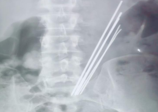 2019年10月30日,延安大學(xué)咸陽(yáng)醫(yī)院內(nèi)鏡中心一如既往,仍是一番忙碌景象。電話響起,我院普外科二病區(qū)來(lái)電,科室就診了一位特殊患者,又一例消化道異物,與此前不同的是,這位病患的異物已吞入達(dá)3年之久,間斷腹痛,未予重視及治療,近來(lái)因臍周疼痛逐日加重,就診于多家醫(yī)院,無(wú)一例外,均建議手術(shù),患者及家屬疲于奔波,最終無(wú)奈接受,遂來(lái)我院要求行手術(shù)治療。主管醫(yī)師接診后積極詢問(wèn)病史,完善相關(guān)檢查,令人訝異的是,3年時(shí)間異物依舊潴留于胃腔之中,腹平片提示為多個(gè)長(zhǎng)條狀金屬異物,棘手之處在于患者拒絕提供關(guān)于異物的詳細(xì)信息。聽(tīng)聞我科上次胃內(nèi)異物取出報(bào)道,主管醫(yī)生抱著試試看的態(tài)度打通了內(nèi)鏡室的電話。
