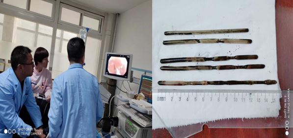 李恒副主任醫(yī)師詳細(xì)了解上述情況后,立即與內(nèi)鏡中心麻醉師張玉河醫(yī)生溝通,暫時(shí)無(wú)法確認(rèn)異物是否嵌頓入胃壁,以及其嵌入深度,普通胃鏡的刺激極有可能加劇患者痛苦,為異物取出造成阻礙,無(wú)痛胃鏡相對(duì)而言,患者痛苦較小,避免了配合度不高等情況,但與此同時(shí),因異物存留于胃腔內(nèi)時(shí)間較長(zhǎng),考慮金屬質(zhì)地,且數(shù)量較多,操作過(guò)程中必然會(huì)面臨很多棘手問(wèn)題,并發(fā)呼吸困難、大出血的風(fēng)險(xiǎn)。消化內(nèi)科一病區(qū)李主任和麻醉醫(yī)師張玉河認(rèn)真翻閱患者相關(guān)信息,制定出嚴(yán)謹(jǐn)、詳盡的治療方案。征得患者及家屬同意后,又一場(chǎng)攻堅(jiān)戰(zhàn)展開(kāi)了......進(jìn)鏡至胃腔,可見(jiàn)5個(gè)長(zhǎng)條形金屬異物滯留,表面光滑,粘液附著,抓取難度非常之大,需在胃腔內(nèi)不斷調(diào)整方向,確保異物以豎直狀態(tài)隨胃鏡緩慢退出,避免異物通過(guò)食管及口腔時(shí)造成的二次損傷,經(jīng)過(guò)反復(fù)不懈努力,最終異物全部安全取出,長(zhǎng)條狀金屬異物最長(zhǎng)達(dá)16cm左右?;颊呒覍匐y掩興奮之情,不停的念叨著“謝謝,謝謝”,內(nèi)鏡下的異物取出讓他們的親人免受手術(shù)之苦,同時(shí)也減輕了經(jīng)濟(jì)負(fù)擔(dān)。