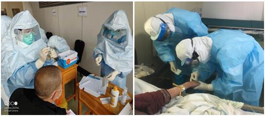 楊文靜為患者采鼻咽拭子、張春妮為患者靜脈穿刺