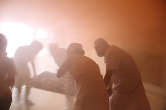 突然,神經(jīng)內(nèi)科三病區(qū)發(fā)現(xiàn)火情、現(xiàn)場濃煙彌漫、火災(zāi)警報(bào)響起,全科醫(yī)護(hù)人員第一時(shí)間及時(shí)到達(dá)火災(zāi)現(xiàn)場,科室所有醫(yī)護(hù)人員啟動(dòng)消防應(yīng)急預(yù)案流程,科主任負(fù)責(zé)現(xiàn)場指揮。護(hù)士長立即安排責(zé)任護(hù)士關(guān)氧源、電源、安全疏散患者及家屬;辦公護(hù)士撥打火警電話及保衛(wèi)科電話并報(bào)告總值班。保衛(wèi)科接到火警電話后,滅火救援小組急速抵達(dá)火災(zāi)現(xiàn)場進(jìn)行滅火救援。小組隊(duì)員身穿消防戰(zhàn)斗服,攜帶滅火裝置及破拆工具,由于火勢較大,滅火器已無法滅火,滅火隊(duì)員從著火點(diǎn)的東西兩個(gè)消火栓,架設(shè)兩條消防水帶,采取先控制后消滅的戰(zhàn)術(shù)進(jìn)行滅火。救援隊(duì)員立即警戒,破拆救援被困人員,緊急疏散按照低姿快跑、濕毛巾捂住口鼻、快速通過濃煙區(qū),疏散群眾至避險(xiǎn)集結(jié)點(diǎn)。