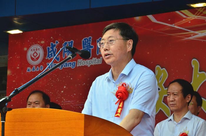 中共陜西省委教育工委、陜西省教育廳一級(jí)巡視員朱征南發(fā)表了重要講話,他肯定了我院在醫(yī)院建設(shè)和醫(yī)療人才培養(yǎng)上所取得的成績(jī),同時(shí)對(duì)延安大學(xué)第三臨床醫(yī)學(xué)院正式掛牌表示祝賀。他指出,延安大學(xué)咸陽(yáng)醫(yī)院作為延安大學(xué)重要的醫(yī)學(xué)人才培養(yǎng)基地,經(jīng)過(guò)二十多年的發(fā)展,已經(jīng)成為地區(qū)醫(yī)療衛(wèi)生事業(yè)和醫(yī)學(xué)教育事業(yè)發(fā)展的重要力量。將咸陽(yáng)醫(yī)院作為延安大學(xué)直屬附屬醫(yī)院,必將為我省醫(yī)學(xué)教育和醫(yī)療衛(wèi)生事業(yè)發(fā)展注入新的活力。他希望延安大學(xué)緊緊圍繞我省“四個(gè)一流”建設(shè),持續(xù)打造一流醫(yī)學(xué)專(zhuān)業(yè)、一流醫(yī)學(xué)課程,深入推進(jìn)新醫(yī)科建設(shè),加大醫(yī)學(xué)復(fù)合型創(chuàng)新拔尖人才培養(yǎng)力度,著力培養(yǎng)黨和人民信賴的好醫(yī)生。同時(shí),也希望延安大學(xué)咸陽(yáng)醫(yī)院發(fā)揮好醫(yī)療、教學(xué)和科研工作的優(yōu)勢(shì),把醫(yī)學(xué)人才培養(yǎng)作為重點(diǎn)工作,健全教學(xué)組織,共享臨床教學(xué)和科研資源,為一流醫(yī)學(xué)人才培養(yǎng)提供保障。