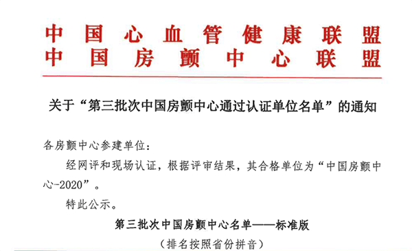 我院于2019年02月,由心血管病院吳棟梁院長牽頭,心血管內科為主體,醫(yī)務部、門急診辦公室、醫(yī)院辦公室提供支持,急診科、心胸外科、腦血管病院、內分泌科、普外科、放射科、超聲醫(yī)學科等多科室協(xié)作,正式啟動房顫中心建設工作。2020年5月獲第三批房顫中心建設單位。2020年10月28日獲得中國房顫中心標準版認證。