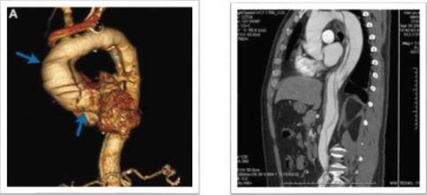 第二例患者36歲男性,職員,馬凡氏綜合癥;主訴“后背部疼痛3小時(shí)”入院,8年前因“馬凡氏綜合征、升主動(dòng)脈瘤并主動(dòng)脈伴關(guān)閉不全”在我科行Bentall手術(shù);入院后行主動(dòng)脈CTA提示:主動(dòng)脈夾層動(dòng)脈瘤(B型)合并主動(dòng)脈弓瘤樣擴(kuò)張,直徑7.0cm,主動(dòng)脈弓至左髂總動(dòng)脈雙腔影,內(nèi)膜片撕裂,并見多發(fā)破口,左側(cè)鎖骨下動(dòng)脈起始部受累,破口內(nèi)徑約0.83-1.28cm,腹腔干起自真假腔,腸系膜上動(dòng)脈假腔;左腎動(dòng)脈起自假腔,右腎動(dòng)脈起自真假腔;該病例為二次手術(shù)患者,且為夾層動(dòng)脈瘤伴弓部瘤樣擴(kuò)張。擬行全主動(dòng)脈弓置換、降主動(dòng)脈支架植入術(shù),手術(shù)順利,術(shù)后第二天拔除氣管插管,第14天出院,恢復(fù)良好。
