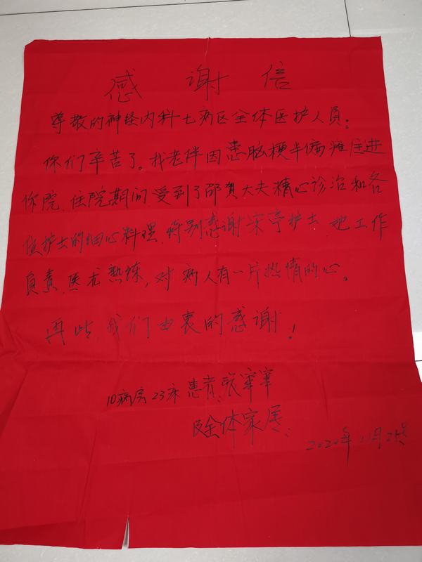 近日,在我科室住院治療多次的老病患為科室送來了一份溫暖又特別的感謝信,信中提到我科醫(yī)護(hù)人員對待病人像親人一樣,說話和氣,行動暖心,著重提出科室李長安主任及邵賀主治醫(yī)師、葛明娟主治醫(yī)師對待病人的熱心、負(fù)責(zé),醫(yī)術(shù)更是精益求精。還有在護(hù)士長的帶領(lǐng)下護(hù)士田攀、宋亭及全體醫(yī)護(hù)人員對待病人和藹可親、細(xì)心呵護(hù)。短短幾句話,滿是患者在多次住院治療期間的感謝和感動。自活動開展以來,一面面熠熠生輝的錦旗,一封封飽含深情的感謝信,是患者對醫(yī)護(hù)人員仁心仁術(shù)的最大肯定,錦旗和感謝信承載著患者對醫(yī)院的信任和感激,象征著醫(yī)患情深,收獲的不僅僅是一份榮譽(yù),更是一份期望、一份鞭策、一份信任,科室將以此為動力,更加努力地為每位患者提供更加優(yōu)質(zhì)的服務(wù)。