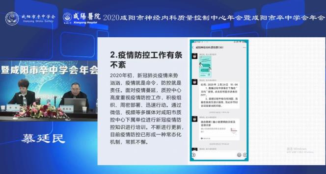 最后,咸陽(yáng)市神經(jīng)內(nèi)科質(zhì)量控制中心主任、咸陽(yáng)市卒中學(xué)會(huì)會(huì)長(zhǎng)、延安大學(xué)咸陽(yáng)醫(yī)院腦血管病院院長(zhǎng)慕廷民教授進(jìn)行了《咸陽(yáng)市神經(jīng)內(nèi)科質(zhì)量控制中心暨卒中學(xué)會(huì)工作匯報(bào)》。他表示,我院作為咸陽(yáng)市神經(jīng)內(nèi)科質(zhì)量控制中心牽頭單位,咸陽(yáng)市卒中學(xué)會(huì)會(huì)長(zhǎng)單位,在市科協(xié)、衛(wèi)健委的關(guān)心指導(dǎo)下,在社會(huì)各界人士的支持下,一直秉持初心,砥礪前行,并且已經(jīng)在神經(jīng)內(nèi)科質(zhì)控和卒中防治事業(yè)的道路上取得了一定的成績(jī)。2021年在上級(jí)單位的領(lǐng)導(dǎo)下,依托咸陽(yáng)市神經(jīng)內(nèi)科質(zhì)量控制中心和咸陽(yáng)市卒中學(xué)會(huì),我院將繼續(xù)與全市同仁一道,站在新的起點(diǎn)和高度,以更長(zhǎng)遠(yuǎn)的眼光、更寬闊的胸襟,攜手共同推進(jìn)咸陽(yáng)市腦血管病防治事業(yè)的發(fā)展,共同為人民健康事業(yè)做出貢獻(xiàn)。