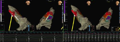 近日,我院心血管內(nèi)科三病區(qū)獨(dú)立成功完成了首例三維標(biāo)測(cè)系統(tǒng)指導(dǎo)下的室早射頻消融術(shù)。由電生理團(tuán)隊(duì)蔡萍主任醫(yī)師為術(shù)者。病人是一位48歲男性患者,心悸、心臟漏跳感8月,24小時(shí)動(dòng)態(tài)心電圖提示室性早博20764個(gè)(室早負(fù)荷約20%),體表心電圖特點(diǎn)判斷室早起源于右室流出道,診斷為特發(fā)性室性早搏。反復(fù)藥物治療患者癥狀無明顯改善。根據(jù)國(guó)內(nèi)外室性心律失常治療指南,患者有導(dǎo)管射頻消融指征。充分與患者溝通后并積極完善術(shù)前準(zhǔn)備,于2020年2月21日在Ensite三維標(biāo)測(cè)系統(tǒng)指導(dǎo)下,通過激動(dòng)標(biāo)測(cè)及起搏標(biāo)測(cè),確定消融靶點(diǎn)位于右室流出道游離壁。以30W和43°消融8秒時(shí),室早消失,共消融120秒。觀察30分鐘,應(yīng)用異丙腎上腺素激發(fā),均無室早出現(xiàn),手術(shù)順利完成。術(shù)后心電圖檢查未見室早,患者的心悸等癥狀消失。