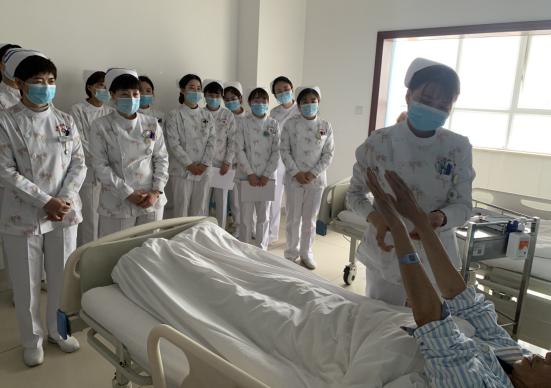 此次護理查房為一例急性腦梗死溶栓及腦動脈造影術后患者,首先王寶艷護士長進行了此次查房目的介紹,鄧梅護師采用PPT形式進行基本情況匯報,之后到床旁查體。通過拋問題,展開討論,疼痛科張蓓蕾護士長對深靜脈血栓的預防有獨到見解,指導護士在觀察足背動脈搏動和測量周徑時做好標記,既能減少護士工作量又能做到測量的精準性;精神科薛娜護士長對卒中患者的焦慮和抑郁進行了剖析;康復醫(yī)學科韓瑞主管護師對偏癱患者功能鍛煉和言語障礙患者做了專科指導;NICU董星辰護師、腦病急診科陳萍護師為卒中患者溶栓和造影后肌力的判斷做了答疑解惑。王寶艷護士長對查房內容進行了總結及補充,指出溶栓造影后病情觀察、健康指導的重要性。