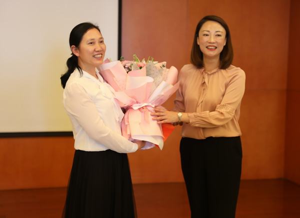 區(qū)委常委、組織部部長(zhǎng)李婉妮同志向廉秋芳教授送上鮮花及慰問(wèn)金