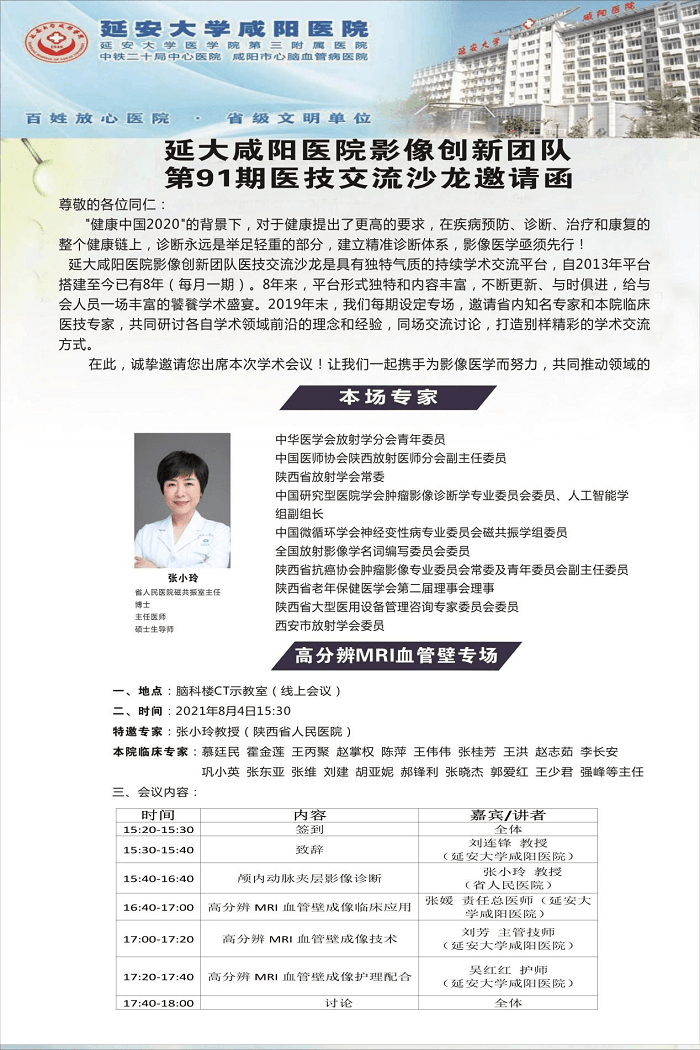 為統(tǒng)籌做好新冠肺炎疫情防控和“醫(yī)技交流沙龍”活動的開展,2021年8月25日,延安大學(xué)咸陽醫(yī)院第91期醫(yī)技交流活動延遲兩周后,在腦科樓CT/MRI示教室成功舉辦,會議采用遠程設(shè)備、以線上方式進行,由延安大學(xué)咸陽醫(yī)院院長助理兼醫(yī)學(xué)影像科主任劉連鋒教授主持,特邀陜西省人民醫(yī)院磁共振室主任張小玲教授線上遠程授課指導(dǎo),我院神經(jīng)內(nèi)科十病區(qū)張東亞主任、心內(nèi)VIP王顯利主任等臨床專家參加本次活動,我院影像及臨床醫(yī)、技、護共40余人參加了本次會議。