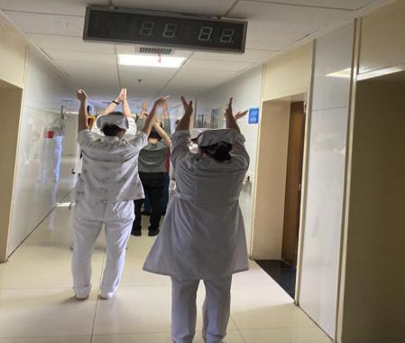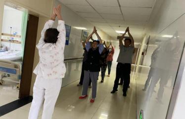 在延安大學(xué)咸陽(yáng)醫(yī)院內(nèi)科樓三樓呼吸與危重癥醫(yī)學(xué)科走廊上每天下午便會(huì)出現(xiàn)一道亮麗的風(fēng)景線。隨著呼吸操節(jié)奏響起,醫(yī)護(hù)人員和患者整齊排列,個(gè)個(gè)神清氣爽,隨著領(lǐng)操人員的口令∶“第一節(jié),吸、呼……”一段有助于肺康復(fù)訓(xùn)練,提高呼吸系統(tǒng)功能的健康呼吸操就開(kāi)始了!領(lǐng)操護(hù)士邊示范邊講解道:“吸氣,雙臂上舉,下蹲呼氣……”身后患者和家屬們跟隨著她的動(dòng)作,邊做操邊調(diào)整呼吸。
