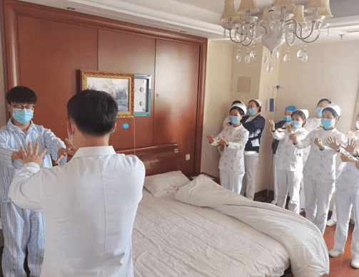 周圍觀摩的護(hù)士長及護(hù)士們也紛紛跟著康復(fù)師活動起來,現(xiàn)場氣氛如火如荼。