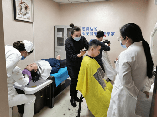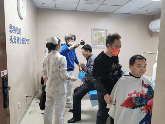 各位發(fā)型師自帶理發(fā)工具,理發(fā)過程中嚴(yán)格把控衛(wèi)生防疫措施,每個(gè)發(fā)型師均佩戴口罩,并對剪發(fā)工具、理發(fā)場所用酒精等進(jìn)行消毒。在我院皮膚科工作人員的大力協(xié)助下,7位發(fā)型師在兩天時(shí)間內(nèi)為我院240位職工義務(wù)剪發(fā)。