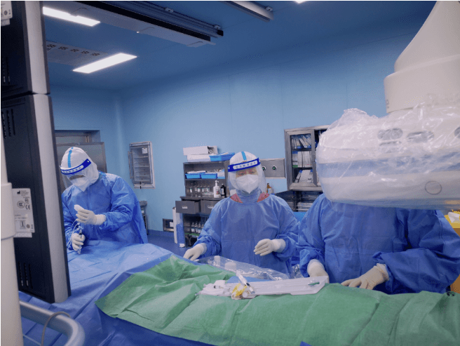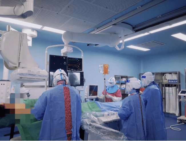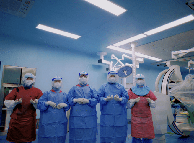 然而,3月12日晚科內(nèi)兩名冠心病患者頻繁發(fā)生心絞痛、用藥后效果十分不理想,當(dāng)下考慮為ACS,血管可能有重度狹窄,隨時(shí)病情可能會(huì)進(jìn)一步演變而危及生命。至當(dāng)前為止第一輪核酸全員均為陰性,但仍不可掉以輕心。蔡主任通過(guò)微信工作群及電話向我院張海濤院長(zhǎng)、吳棟梁院長(zhǎng)匯報(bào)科室情況,邀請(qǐng)感控辦楊竹杏主任及導(dǎo)管室曹妙云護(hù)士長(zhǎng)等人進(jìn)行線上討論,經(jīng)過(guò)分析評(píng)估并遵循咸陽(yáng)市疫情防控指揮部關(guān)于疫情防控期間積極救治不同風(fēng)險(xiǎn)區(qū)域患者的要求,一致決定開通綠色通道,嚴(yán)格按照新冠肺炎工作流程條例為患者進(jìn)行介入手術(shù)治療,確?;颊呱踩?br /> 3月13日上午,在心血管病院吳棟梁院長(zhǎng)組織和指導(dǎo)下,后勤保障部設(shè)立專用通道、蔡萍主任介入團(tuán)隊(duì)在高愛倩、姚姬花、張娜護(hù)師及孔飛技師等各位同仁的全力配合下,在獨(dú)立系統(tǒng)百級(jí)層流凈化手術(shù)間,為患者實(shí)施了冠脈造影術(shù)及支架植入術(shù)。介入手術(shù)具有特殊性,微創(chuàng)的優(yōu)勢(shì)取決于放射性儀器的運(yùn)用,在射線下進(jìn)行操作,術(shù)者及配臺(tái)護(hù)士均要穿戴大概30多斤重的防護(hù)鉛衣、鉛圍脖、鉛帽、鉛眼鏡、無(wú)菌一次性手術(shù)衣。而為封控期間的患者進(jìn)行手術(shù),醫(yī)務(wù)人員按照防控規(guī)范要求需再穿上防護(hù)服、面屏、靴套等。為了減少感染機(jī)會(huì)他們穿上尿不濕,數(shù)層緊密包裹,悶熱與負(fù)重程度增加了數(shù)倍,同時(shí),多層橡膠手套對(duì)于精細(xì)的介入操作也帶來(lái)了很大的挑戰(zhàn)。為了確保患者的生命安全、減少患者的病痛,當(dāng)天為7名患者進(jìn)行了心臟介入手術(shù),手術(shù)時(shí)間持續(xù)8小時(shí)之久,全程白衣鎧甲均是站立姿勢(shì)。他們用汗水和責(zé)任,用仁心與擔(dān)當(dāng),捍衛(wèi)了患者生命安全。術(shù)后按照《新冠肺炎防控方案第八版》對(duì)介入導(dǎo)管室、專用通道等進(jìn)行終末消殺。