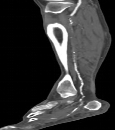 情急之下去了當地醫(yī)院,醫(yī)生一瞧告訴王大伯:“您這可能是糖尿病足,你這傷口肯定是長不好了,需要外科手術清創(chuàng)、植皮,如果還是長不好就要截肢”。聽了醫(yī)生的話,王大伯出了一身冷汗,幾經周折最終來到了我院血液內分泌科,住院后進行下肢動脈超聲及CTA發(fā)現:雙下肢膝下動脈節(jié)段性狹窄、閉塞。診斷為:右下肢動脈硬化閉塞癥(Runtherford6級),糖尿病下肢嚴重缺血(右側),右足潰瘍;經多學科會診初期"改善循環(huán)、控制血糖、抗感染、局部清創(chuàng)換藥、營養(yǎng)神經、支持治療"六環(huán)法措施下,老伯潰瘍雖有好轉,但仍不能完全愈合,右足仍靜息下疼痛。