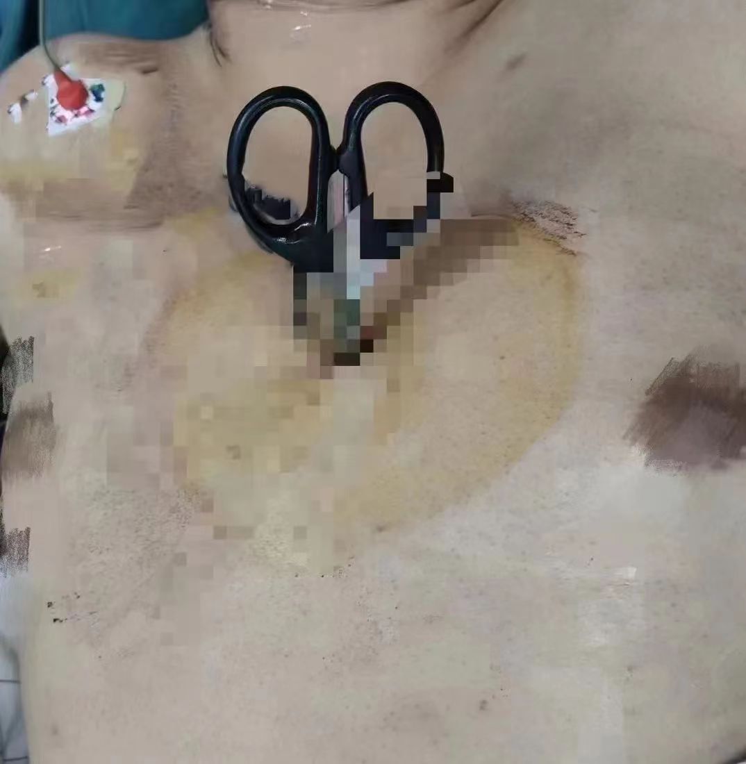 查看病人病情及CT后,考慮到刀尖離心臟較近,隨時有加重?fù)p傷的可能,武小剛主任當(dāng)機(jī)立斷,將拔了剪刀向外拔出約5mm,局部固定,避免遂呼吸或搬動患者造成進(jìn)一步損傷心臟。因患者病情特殊,術(shù)前、術(shù)中不可預(yù)知風(fēng)險較多,武小剛主任與麻醉科醫(yī)師溝通后,分析病情:“手術(shù)患者剪刀斜著刺入,有損傷肋間及乳內(nèi)動脈可能,故需全麻下手術(shù)拔除,萬一已傷到胸壁血管,那就需要開胸止血,否則大出血會導(dǎo)致患者休克而死亡;如拔出后出血少,動態(tài)觀察后可不劈開胸骨,減少了對患者更大的損傷,也能保住患者的生命,其次手術(shù)需打破傷風(fēng)抗毒素及預(yù)防使用抗生素,減少術(shù)后感染的風(fēng)險”。術(shù)中,對插入剪刀周圍進(jìn)行嚴(yán)格消毒,徹底游離周圍組織,避免出血而無法準(zhǔn)確定位止血,隨后小心翼翼的將剪刀拔除,骨面可見少量出血,觀察半小時未見明顯出血,血壓平穩(wěn),手術(shù)順利,這才松了口氣。術(shù)后1小時左右患者清醒,哽咽著對武主任及科室醫(yī)護(hù)人員說:“謝謝醫(yī)生,謝謝你們,真的,真的太感謝了,不瞞您說,后事我已經(jīng)跟家人交代過了……”。武主任輕拉患者的手說:“你真是不幸中的萬幸啊,差一點(diǎn)你就沒機(jī)會來醫(yī)院了,也別緊張了,再恢復(fù)恢復(fù)就回家,以后多注意”。術(shù)后監(jiān)測生命體征,第二天拔除引流管,按時換藥,復(fù)查心臟彩超、胸部CT,未見異常于1周后痊愈出院。