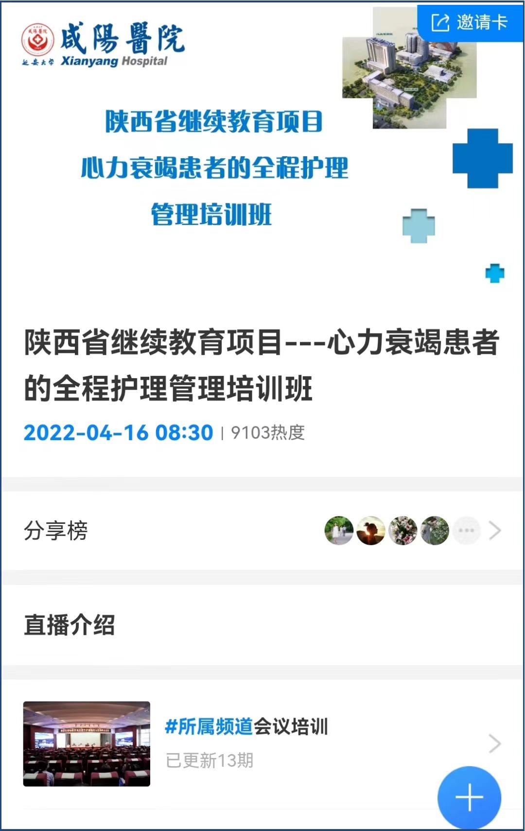 2022年4月16日,由延安大學(xué)咸陽(yáng)醫(yī)院主辦的陜西省繼續(xù)醫(yī)學(xué)教育項(xiàng)目——“心力衰竭患者的全程護(hù)理管理培訓(xùn)班” 在我院隆重召開(kāi)。延安大學(xué)咸陽(yáng)醫(yī)院張海濤院長(zhǎng)、延安大學(xué)咸陽(yáng)醫(yī)院科研教學(xué)管理中心韓曉芳主任、延安大學(xué)咸陽(yáng)醫(yī)院心血管內(nèi)科VIP病區(qū)王顯利主任、延安大學(xué)咸陽(yáng)醫(yī)院護(hù)理部楊敏主任、延安大學(xué)咸陽(yáng)醫(yī)院心血管病院黨文婷總護(hù)士長(zhǎng)、延安大學(xué)咸陽(yáng)醫(yī)院外科病院王長(zhǎng)寧總護(hù)士長(zhǎng)、延安大學(xué)咸陽(yáng)醫(yī)院腦科病院宋春蘭總護(hù)士長(zhǎng)出席開(kāi)幕式。受疫情影響,本次會(huì)議采取線上授課,邀請(qǐng)了多名國(guó)內(nèi)護(hù)理專家授課,線上參會(huì)人數(shù)達(dá)9000余人。