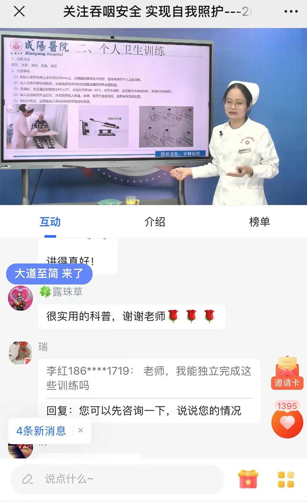 本次科普活動由國家級康復??谱o士韓瑞和張雨擔任主講嘉賓。韓瑞運用通俗易懂的語言為大家詳細講解了吞咽障礙患者如何正確選擇食物、進食時的注意事項、吞咽的代償方法、進食時發(fā)生誤吸以及窒息的緊急處理措施,同時為大家展示了幾種改良的餐具,以供患者在進食時選擇;為了提高偏癱患者的日常生活自理能力,康復??谱o士張雨就日常生活活動能力訓練的內(nèi)容、訓練要點及注意事項進行了深入淺出的講解,著重演示了如何獨立完成穿衣褲、穿鞋襪,如何獨立完成個人衛(wèi)生清潔,希望能夠幫助偏癱患者提高患者生活自理能力。