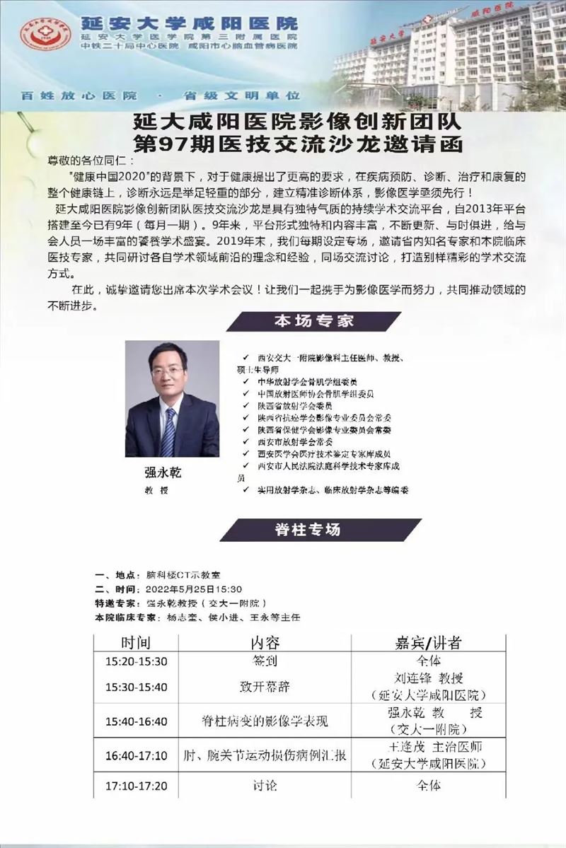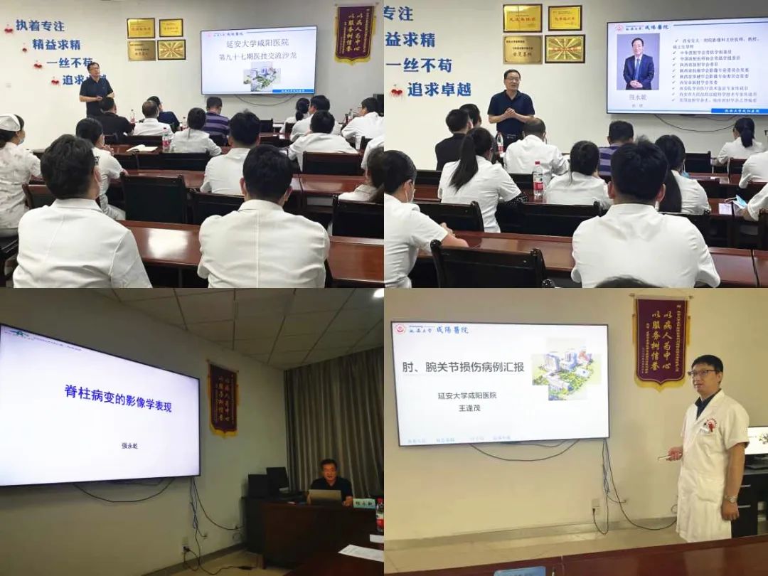 2022年5月25日,延安大學(xué)咸陽(yáng)醫(yī)院第97期醫(yī)技交流活動(dòng)在腦科樓CT/MRI示教室如期舉辦,會(huì)議由延安大學(xué)咸陽(yáng)醫(yī)院院長(zhǎng)助理兼醫(yī)學(xué)影像科主任劉連鋒教授主持,特邀西安交大一附院強(qiáng)永乾教授來院授課,我院骨一科楊志奎主任、骨二科侯曉進(jìn)副主任、康復(fù)科梁莉娜副主任等臨床、影像專家參加了本次會(huì)議。