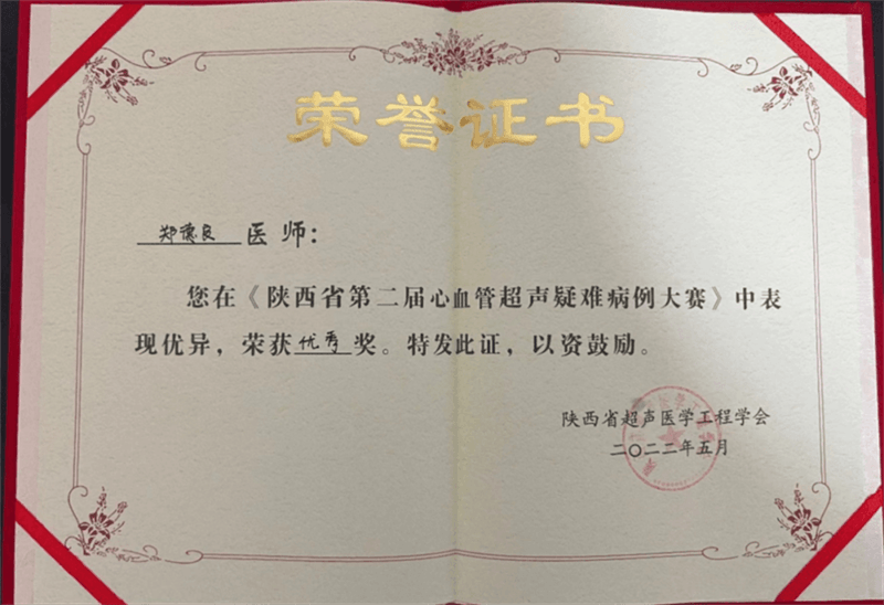 在陜西省超聲醫(yī)學(xué)工程學(xué)會(huì)超聲心動(dòng)圖學(xué)組主辦,西安交通大學(xué)第一附屬醫(yī)院,空軍軍醫(yī)大學(xué)西京醫(yī)院承辦的“陜西省第二屆心血管超聲疑難病例大賽” 中,通過層層篩選,我科鄭德良主治醫(yī)師在地市級(jí)醫(yī)院為數(shù)不多的參賽選手中榮獲優(yōu)秀獎(jiǎng)并獲點(diǎn)評(píng)老師高度評(píng)價(jià)。