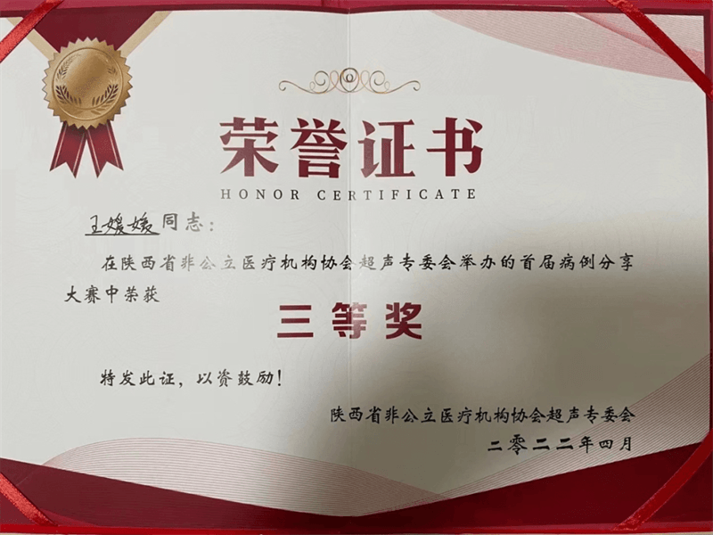 在陜西省非公立醫(yī)療機(jī)構(gòu)協(xié)會(huì)超聲專委會(huì)主辦,西安大興醫(yī)院承辦的“第一屆病例分享大賽”中,通過層層篩選,我科王媛媛主治醫(yī)師喜獲“三等獎(jiǎng)”,王莎醫(yī)師代替賈貝主治醫(yī)師參賽喜獲“優(yōu)秀獎(jiǎng)”。