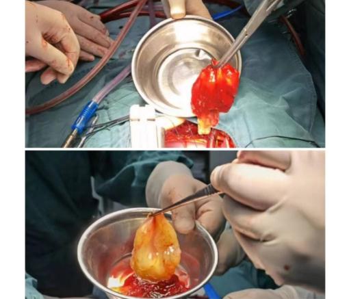 劉先生經(jīng)檢查顱腦CT未見(jiàn)腦梗塞病灶,全面評(píng)估后,無(wú)手術(shù)禁忌,入院后第三天安排手術(shù)治療,經(jīng)過(guò)心外科武小剛主任為核心的心外科團(tuán)隊(duì)積極配合,手術(shù)全程2.5小時(shí),術(shù)中完整取出巨大膠凍樣瘤體組織2枚,經(jīng)病理檢查提示:“粘液瘤組織伴出血、壞死”。術(shù)后在醫(yī)護(hù)精心的護(hù)理下患者恢復(fù)良好,于術(shù)后第8天痊愈出院,咳嗽癥狀完全消失。