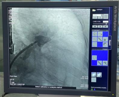 穿刺房間隔后置入6F豬尾導(dǎo)管,于CAU20°,RAO35°進(jìn)行左心耳造影,可見(jiàn)左心耳為大角度反雞翅形,測(cè)量左心耳開(kāi)口26mm,深度25mm。各位在線的專(zhuān)家有張玉順教授、宋治遠(yuǎn)教授、胡浩教授等,進(jìn)行了熱烈討論后,一致認(rèn)為該例手術(shù)難度較大,封堵傘不易釋放。