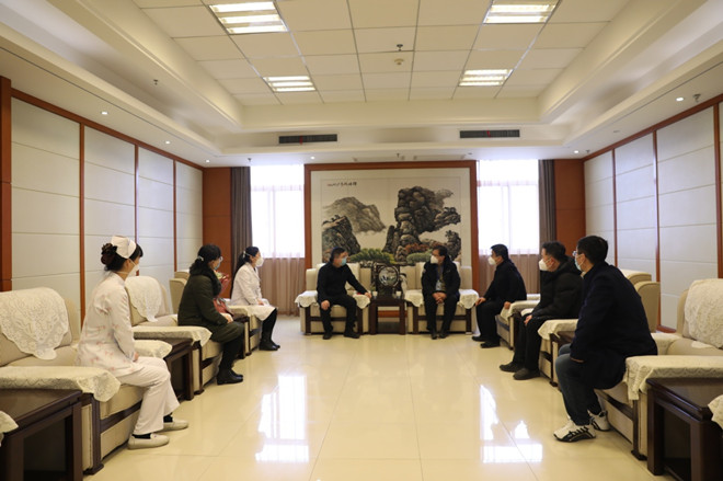 趙雄飛院長首先代表腦血管病院全體干部職工對區(qū)政府、區(qū)衛(wèi)健局領導一行來院慰問張桂芳教授表示感謝,對她日常工作及為醫(yī)院做出的突出貢獻給予高度的肯定。區(qū)政府副區(qū)長孫佳佳同志向張桂芳教授送上新春祝福及慰問金,感謝她為區(qū)域醫(yī)療衛(wèi)生事業(yè)發(fā)展所做出的突出貢獻,并詳細詢問了醫(yī)院新冠肺炎收治及診治近況,指出“所有的歲月靜好,只因有人在負重前行”,對工作一線的醫(yī)護人員表達了崇高的敬意和充分的肯定,叮囑大家勞逸結合,在堅守工作崗位的同時,確保自身健康安全。
