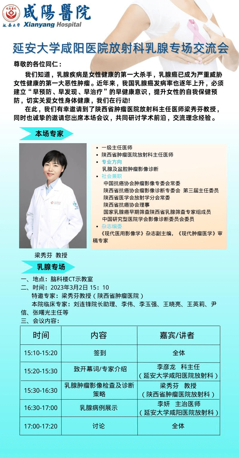 2023年3月2日,延安大學(xué)咸陽醫(yī)院X線診斷專業(yè)“乳腺專場交流會”在腦血管病院示教室成功舉辦,會議由X線診斷專業(yè)李彥龍副主任主持,特邀陜西省腫瘤醫(yī)院放射科主任梁秀芬教授現(xiàn)場授課指導(dǎo),劉連鋒院長助理、腫瘤胸外科李偉副主任、普通外科二病區(qū)李玉強副主任、放療科尹信主任、超聲診斷專業(yè)王英莉副主任等臨床、影像專家及醫(yī)、技、護共40余人參加了本次會議。