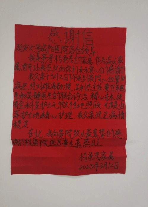在出院之際,患者楊大爺為心血管內(nèi)科十病區(qū)送上了由衷的感謝,并表示:“心血管內(nèi)科十病區(qū)醫(yī)護(hù)團(tuán)隊(duì)高超的醫(yī)術(shù),精心的護(hù)理,整潔的環(huán)境,使我們感受到了家的溫暖。”