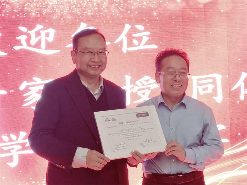 我院房顫介入治療突飛猛進(jìn),成績喜人,技術(shù)進(jìn)步快速,會(huì)后由張玉順教授向我院常務(wù)副院長兼心血管病院院長吳棟梁頒發(fā)了“左心耳封堵全球帶教專家”證書,對(duì)我們?nèi)〉玫某煽兗敖槿胨竭M(jìn)行了充分的肯定。