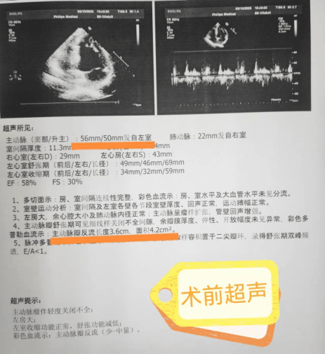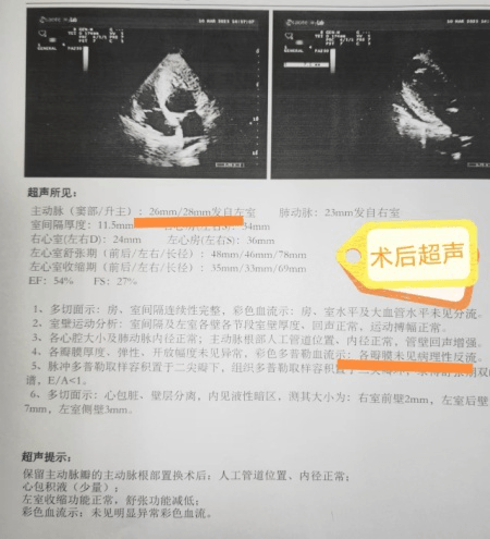 患者為69歲老年男性,因“活動(dòng)后胸悶、氣短”入院,心臟彩超提示:主動(dòng)脈竇部擴(kuò)張(57mm)伴主動(dòng)脈瓣反流(4.2cm²),武小剛主任團(tuán)隊(duì)親臨超聲科會(huì)診查看,結(jié)合胸部CT,發(fā)現(xiàn)其竇瘤較大,但主動(dòng)脈瓣瓣葉質(zhì)地良好,考慮行保留主動(dòng)脈瓣主動(dòng)脈根部置換+主動(dòng)脈瓣成形術(shù)。經(jīng)充分準(zhǔn)備,術(shù)中精心設(shè)計(jì),耐心操作,圓滿及順利地完成了手術(shù),術(shù)后患者恢復(fù)良好,10天出院,出院前復(fù)查心臟彩超:升主動(dòng)脈直徑正常,主動(dòng)脈瓣未見(jiàn)反流,手術(shù)效果滿意。