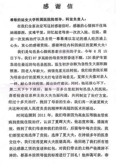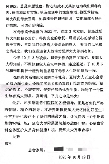 從2011年開始,患者因腦血管病在我院治療,在這十幾年中,每次身體不適或病情危重都是在夏輝醫(yī)生及宋彤玫護士精心的治療和護理下好轉出院。多年來患者一家與兩人建立了深厚的感情。10月3日患者因病去世,但是有感于神內四病區(qū)醫(yī)護人員十年中對母親的悉心照料和精心診療,子女四人在處理完后事就帶著錦旗和感謝信來到醫(yī)院。家屬緊緊握著張桂芳主任的手,激動的說“衷心感謝你們這十幾年對我母親無微不至的照護,很幸運能遇到這樣一個優(yōu)秀的團隊,太感謝你們了,也祝愿你們醫(yī)院越辦越好......”滿滿的兩頁紙,承載了一段親如家人、溫暖和諧的醫(yī)患情,家屬用樸實的語言,表達了對我科醫(yī)護人員的感激之情!